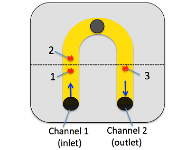 FIG. 1 A schematic drawing of the flow channels and the gold-coated sensing chip (top view). The two channels are connected into a U-shape. The WE for each channel is located at position 1 and 3. The RE is located at the turn of the U-shaped flow stream. The CE (not shown) are positioned in the flow channels above each WE. The solution flows into the cell through channel 1 and exits through channel 2. Position 2 and 3 are at downstream locations. For 100 μL/min flow rate, it takes 0.1 s and 5 s for a sample to flow from position 1 to positions 2 and 3, respectively.