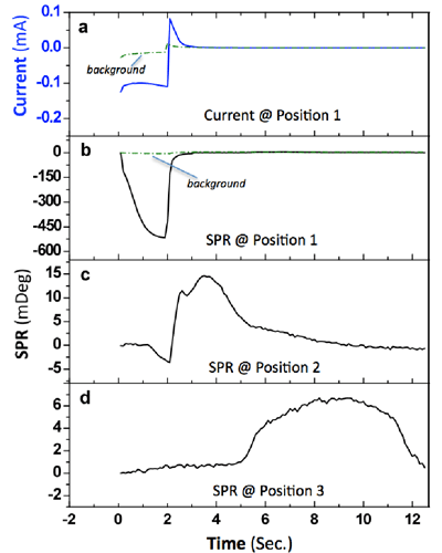 In their work, a potential step was applied to the working electrode (position 1) in the presence and absence of HQ and BQ, and the SPR signals at positions 1, 2 and 3 were monitored as a function of time (FIG. 1). FIG. 2 shows the current at position 1 and the SPR signals at the three positions after stepping the potential to -0.75 V for 2 s and then back to 0 V. In the absence of HQ and BQ, only a small (2 mDeg) SPR shift was detected, which is attributed to the double layer charging (green lines).