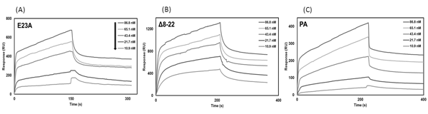 C1r-C1s-C1s-C1r has been previously shown by SPR to bind immobilized C1q with a KD of 2.72 nM [7]. To evaluate the interaction of the peptide with C1q by SPR, we utilized a BI-3000 instrument to measure the affinity of three inhibitory peptides E23A, Δ8-22, and PA (ligand) with human C1q (analyte). The peptide ligands were immobilized on a dextran coated sensor chip with PBS running buffer. The analyte binding was measured in PBS-Tween 20 (0.01%) at a flow rate of 20 μL/min. Surface regeneration after C1q injection was accomplished by injecting 10 mM NaOH. The mean equilibrium dissociation constants (KD) were 6.08 nM for E23A, 5.43 nM for ?8-22, and 33.3 nM for PA (Table 1), respectively. Figure 2 depicts the SPR sensorgrams, which were fitted by the 1:1 model with the mass transport. These dissociation constants show that the peptides bind C1q with high affinity. The binding of E23A, Δ8-22, and PA to C1q with similar affinity for C1s-C1r-C1r-C1s (i.e., nM range) is consistent with our hypothesis that these peptides may function to inhibit classical pathway activation by competitively displacing, at least partially, C1s-C1r-C1r-C1s from C1q. SPR data such as this not only informs our understanding of the mechanism by which these peptides inhibit C1q activation, but will also lay the foundation for preclinical therapeutic development of these peptides [8].
