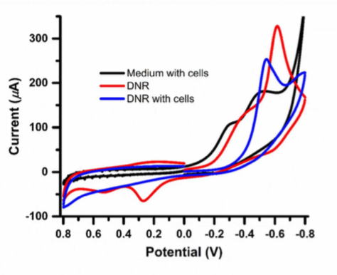 Fig 2 is the cyclic voltammograms (CV) of DNR (10 uM) with and without HepG2 cells in the medium. Without HepG2, the CV (red) shows a pronounced peak at ~0.6 V. The peak shifts positively after incubating with the HpeG2 cells (blue). However, in the absence of DNR, the CV does not show this peak. The redox activity was attributed to two electroacive groups (a p-diquinone and a p-diphenol) of DNR. [3]