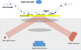 The SPRm 200 from Biosensing Instrument Inc. is a system that seamlessly combines both optical bright-field and SPR microscopies thus enabling the unique in vitro binding kinetic measurement of individual cells in their native environment. The architecture of the system consists of using the SPR phenomenon to measure binding kinetics while also simultaneously permitting use of bright-field microscopy to study topographical and phenotypical changes in the sample (Fig. 1). Typically, the cells are cultured and fixed on a poly-L-lysine coated SPR sensor chip. The integrated optical microscope allows for visualization of the sample with x10 magnification and 1 um resolution. The SPRm 200 exceeds the performance of homemade systems by demonstrating a much larger field of view, simultaneous bright-field and SPR microscopies, and greater stability.