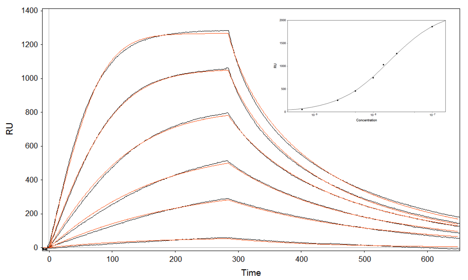 Figure 2. Overlaid experimental and simulated sensorgrams corresponding to the interactions between the immobilized biotinylated Th10-39 and human α-thrombin at six different concentrations. (Inset) A plot of the maximum responses plotted against the concentrations of human α-thrombin along with the Langmuir isotherm.