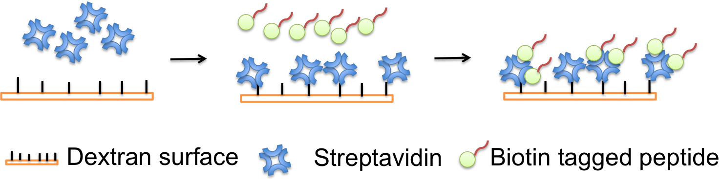 In this note, the assay was run with streptavidin immobilized onto the SPR sensor chip to capture biotinylated peptides (Figure 1). To measure the dissociation equilibrium constant between the molecules, a five-channel SPR (BI-4500) and a streptavidin sensor chip from Biosensing Instrument were used.