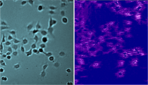 Fig 1 Bright field image of HEK 293A cells (left), SPR image of small molecule drug binding to HEK 293A (right).