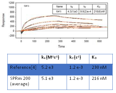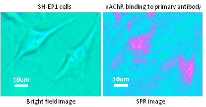 繪制nACHRs的結(jié)合行為 nAChR膜受體在神經(jīng)傳遞和尼古丁成癮中起關(guān)鍵作用。確定它們?cè)诩?xì)胞中分布的常規(guī)方法基于熒光標(biāo)記的二次抗體,其不提供直接的動(dòng)力學(xué)并且易于發(fā)生假陽(yáng)性。SPRm200直接測(cè)量第一抗體與不含第二抗體的nAChR的結(jié)合。該過(guò)程更加簡(jiǎn)單,克服了使用被標(biāo)記的第二級(jí)抗體所帶來(lái)的缺陷。