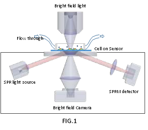 SPRm200把SPR技術(shù)和光學(xué)成像結(jié)合起來(lái),能夠把活細(xì)胞成像和對(duì)藥物分子結(jié)合反應(yīng)定位分布圖像實(shí)時(shí)地表征出來(lái)。如圖1所示,明視場(chǎng)聚光燈將生長(zhǎng)于芯片表面的細(xì)胞照亮,在底部的照相機(jī)捕獲活細(xì)胞的明視場(chǎng)。同時(shí)SPR光源沿共振角度投射光線到傳感器芯片上,由SPRm200探測(cè)器捕捉反射光,并把在每一個(gè)像素點(diǎn)上的SPR響應(yīng)信號(hào)記錄下來(lái)構(gòu)成SPR像圖。