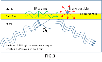在納米尺度上,由一個(gè)納米顆粒所產(chǎn)生的SPR響應(yīng)信號(hào)非常獨(dú)特。就好像把一個(gè)小石子放在一個(gè)緩緩流動(dòng)的淺溪中,水面上就會(huì)產(chǎn)生一個(gè)波紋圖案(參考下圖)。SPR光源按共振角度投射到傳感器芯片上使其產(chǎn)生一個(gè)沿著金屬膜表面?zhèn)鞑サ谋砻娴入x子體(SP)波,如圖3所示。當(dāng)一個(gè)納米顆粒結(jié)合到芯片表面時(shí),它便成為SP波的散射點(diǎn),因而會(huì)在SPR像中產(chǎn)生波紋圖案。其形狀遠(yuǎn)遠(yuǎn)大于納米顆粒的實(shí)際尺寸(100 倍以上)。這放大的波紋圖案使得SPRm200能夠檢測(cè)到粒子尺度遠(yuǎn)小于其光學(xué)衍射的極限,通過(guò)對(duì)這個(gè)放大的波紋圖案進(jìn)行跟蹤和測(cè)量,就能實(shí)現(xiàn)對(duì)分子在納米尺度下的結(jié)合行為進(jìn)行監(jiān)測(cè)和研究。